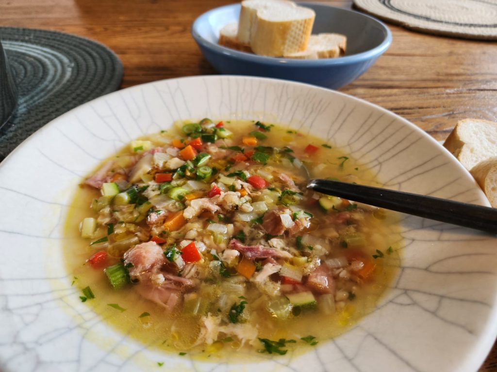 The dish is packed with veggies, grains and natural gelatine you get from the hock, giving it a great texture. Typically, the hocks have enough salt to season this recipe without the need to add more.