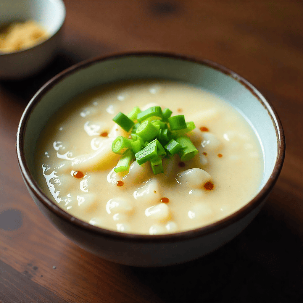 Ladle the hot congee into bowls. Top each serving with a splash of soy sauce, a few slices of spring onion, chopped ginger, and a drizzle of sesame oil.
